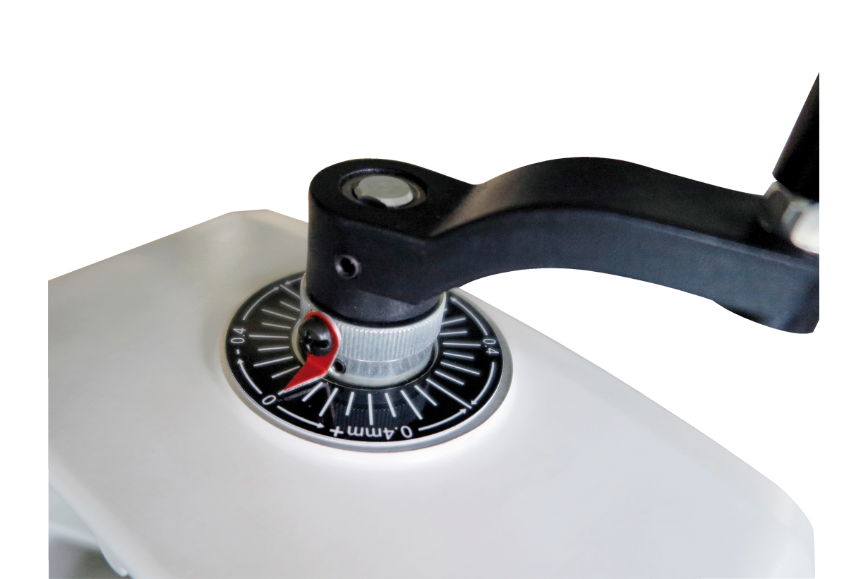 Высота над лентой транспортера регулируется вращением рукоятки, при этом можно контролировать как абсолютное значение по миллиметровой шкале на корпусе, так и относительное перемещение по лимбу на рукоятке. Регулировка параллельности вала и основания производится без вспомогательного инструмента: два фиксатора и винтовой упор оборудованы барашковыми рукоятками.