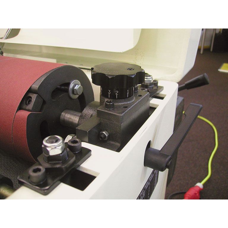 Конструкция с двумя валами позволяет использовать абразивы с разной зернистостью, то есть за один проход производить грубую и финишную шлифовку. Для достижения наилучшего результата предусмотрена точная регулировка положения выходного вала относительно приёмного, высоту которого подбирают в зависимости от зернистости абразива. Регулировка по высоте шлифовки производится независимо за счет опускания транспортёрного стола. Он размещен на четырёх опорах и регулируется с точностью до 0,2 мм по всей ширине. На практике, разброс толщины после шлифовки на хорошо настроенном DDS-237 значительно меньше. При такой точности станки способны снимать за один проход до 1,5 мм по всей ширине, необходимо лишь правильно подобрать абразив и скорость подачи (2 или 3 м/мин).