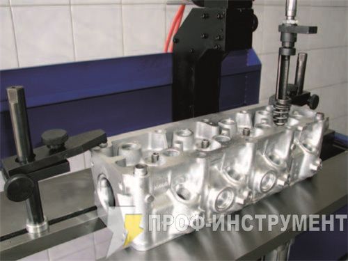 Станок оборудован пневматическим цилиндром для работы с клапанами их сборкой и разборкой: много рабочих положений, которые адаптированы для всех типов головок цилиндра; управление с помощью ножной педали, оборудован регулятором давления.