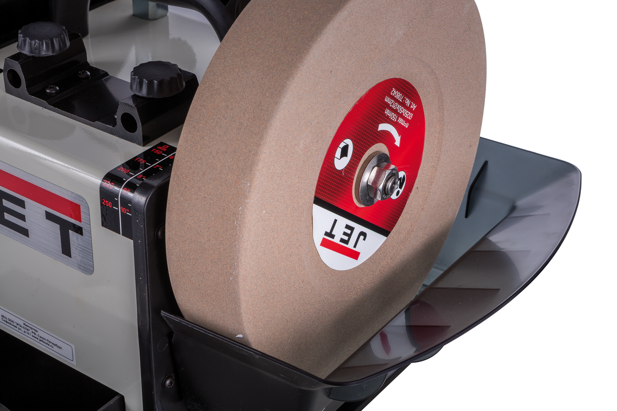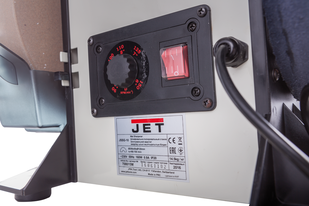 Jet JSSG-10 - шлифовально-полировальный станок для заточки, правки и доводки режущего инструмента (в основном ручного) с высокой точностью и без отпуска режущей кромки. Вал с кругами (абразивным, шлифовальным и кожаным полировальным) вращается с небольшой скоростью, которую можно регулировать при помощи рукоятки на передней панели станка. Шлифовальный камень погружен в ванну для смачивания водой.